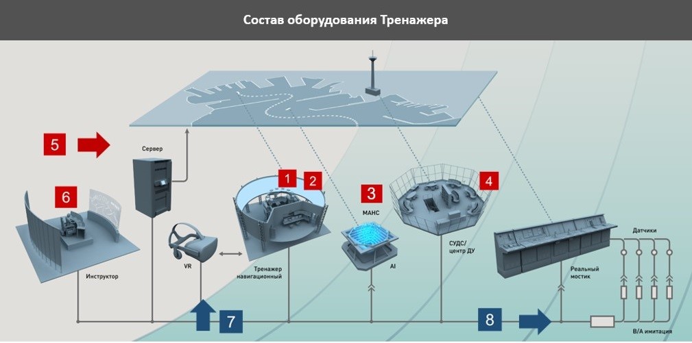 Ключевая особенность в том, что тренажер моделирует функции реальных приборов, причем панели управления имитаторов приближены к панелям управления навигационных и береговых приборов. Технологии виртуальной и дополненной реальности имитационного управления, а также отображение оборудования ходового мостика, обеспечивают тактильное и визуальное восприятие обучаемым окружающей и навигационной обстановки в условиях реального времени.