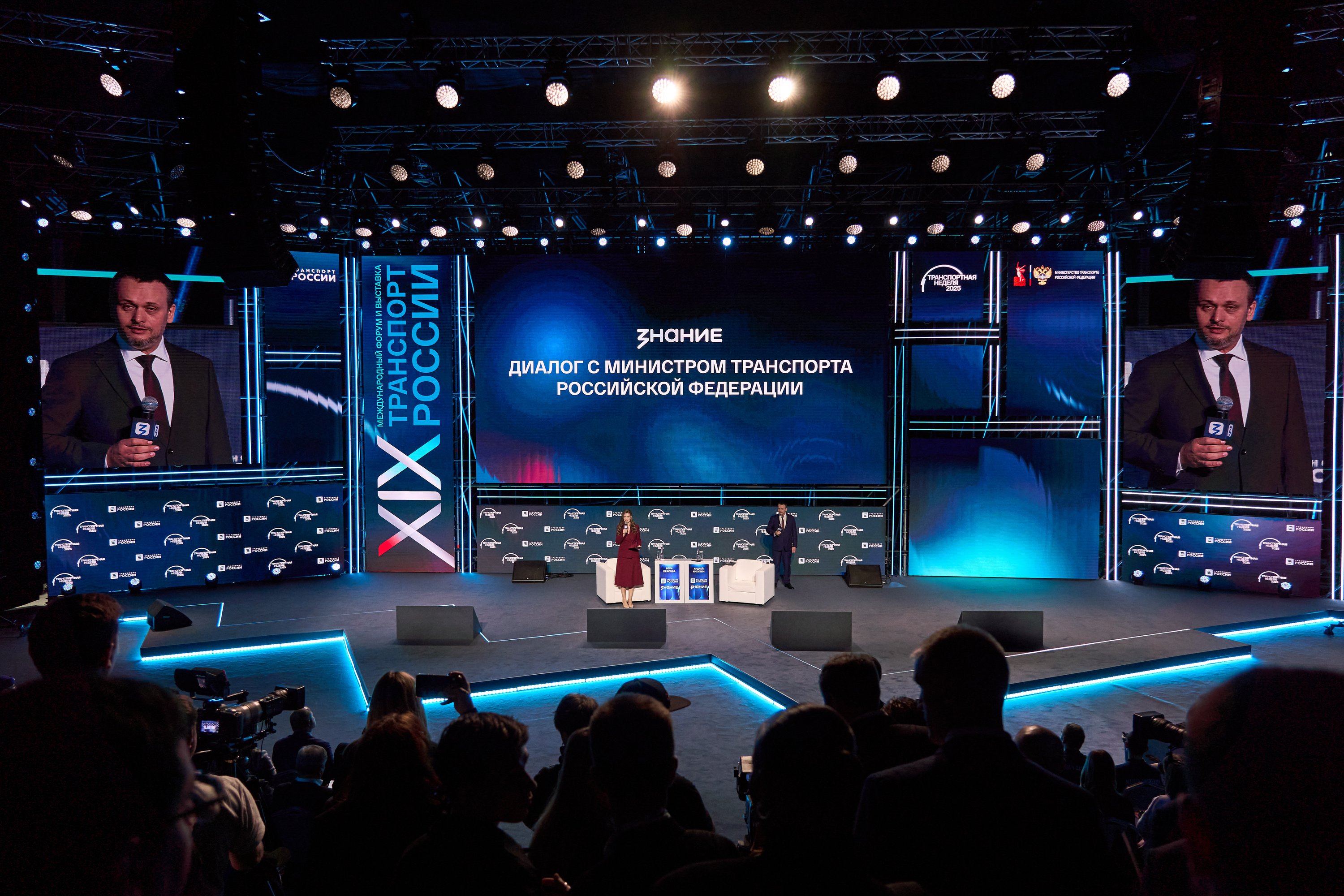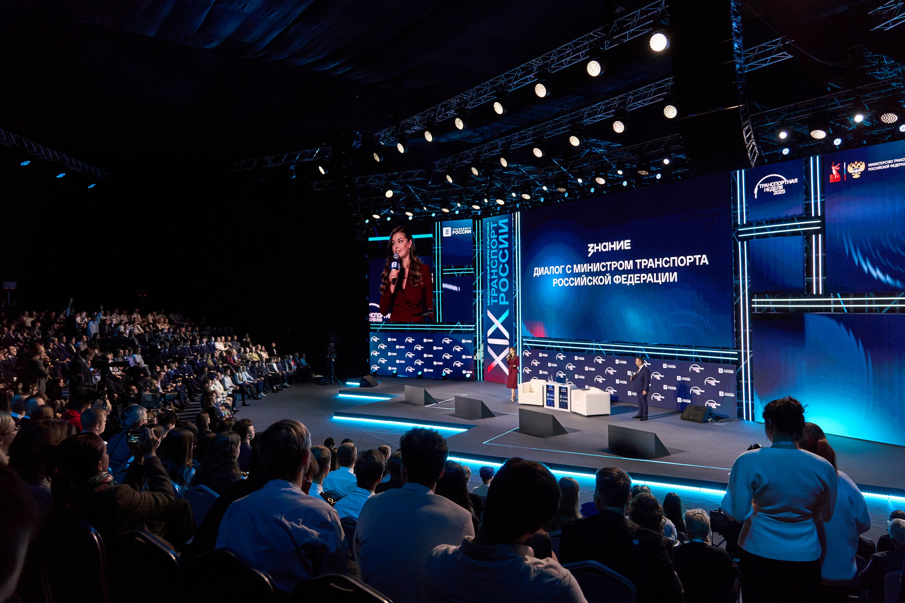 Министр транспорта РФ Андрей Никитин провёл открытый диалог на выставке-форуме «Транспорт России». Мероприятие организовано Российским обществом «Знание» для обсуждения актуальных тем и перспектив отрасли и прямого взаимодействия между руководством отрасли и перспективными кадрами — студентами транспортных вузов.