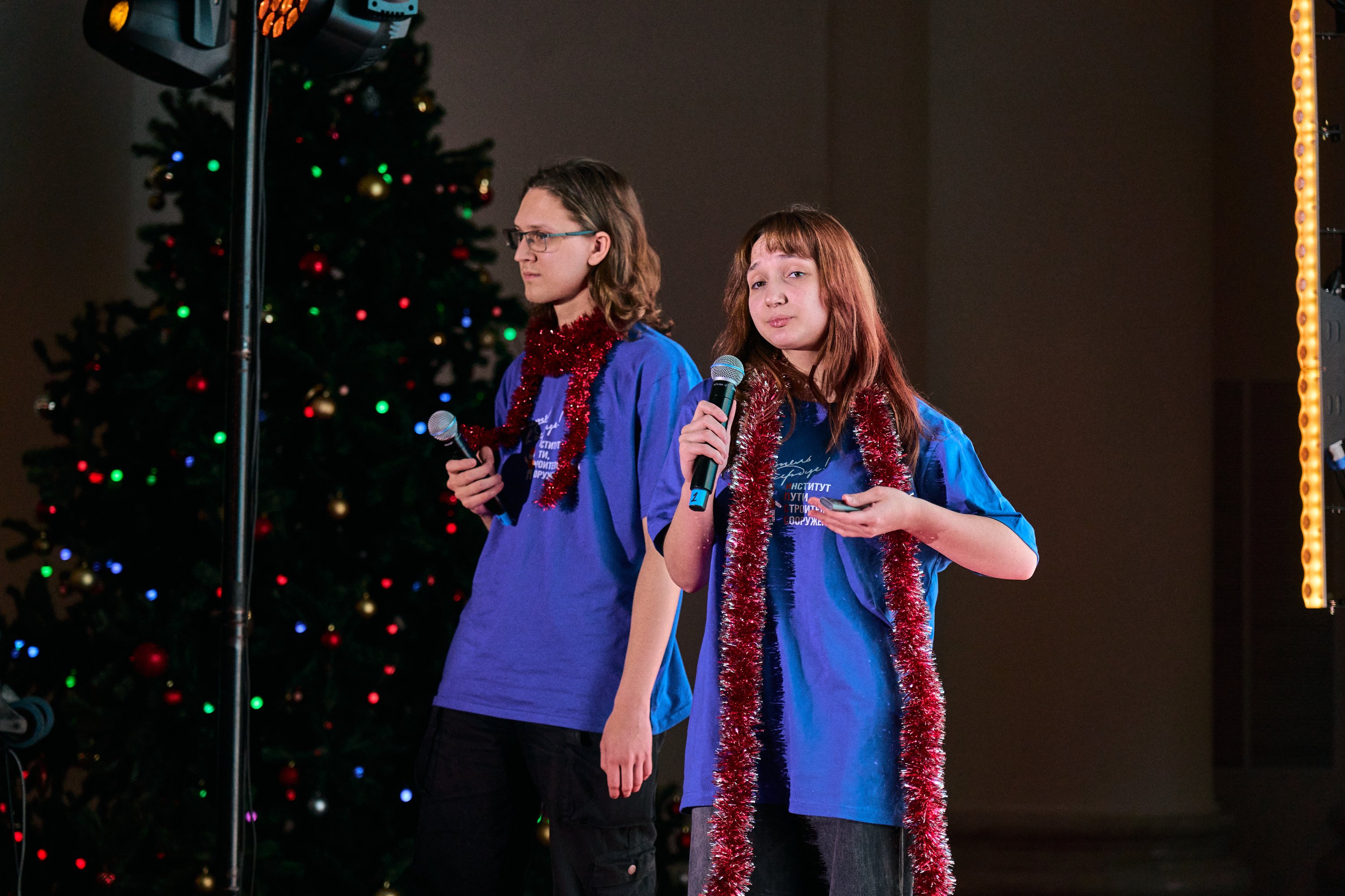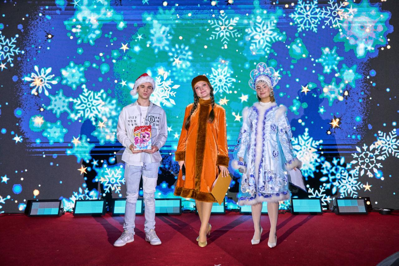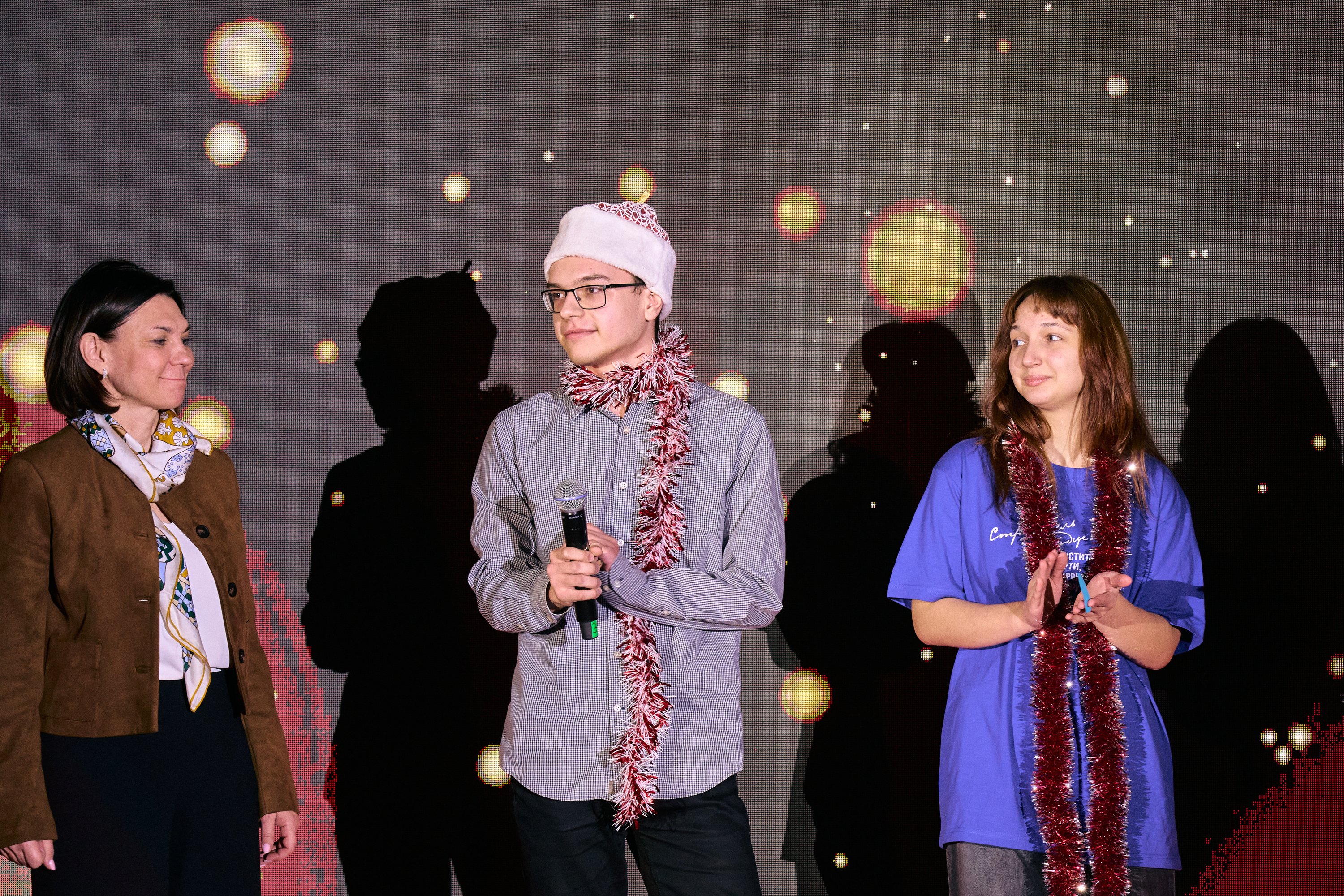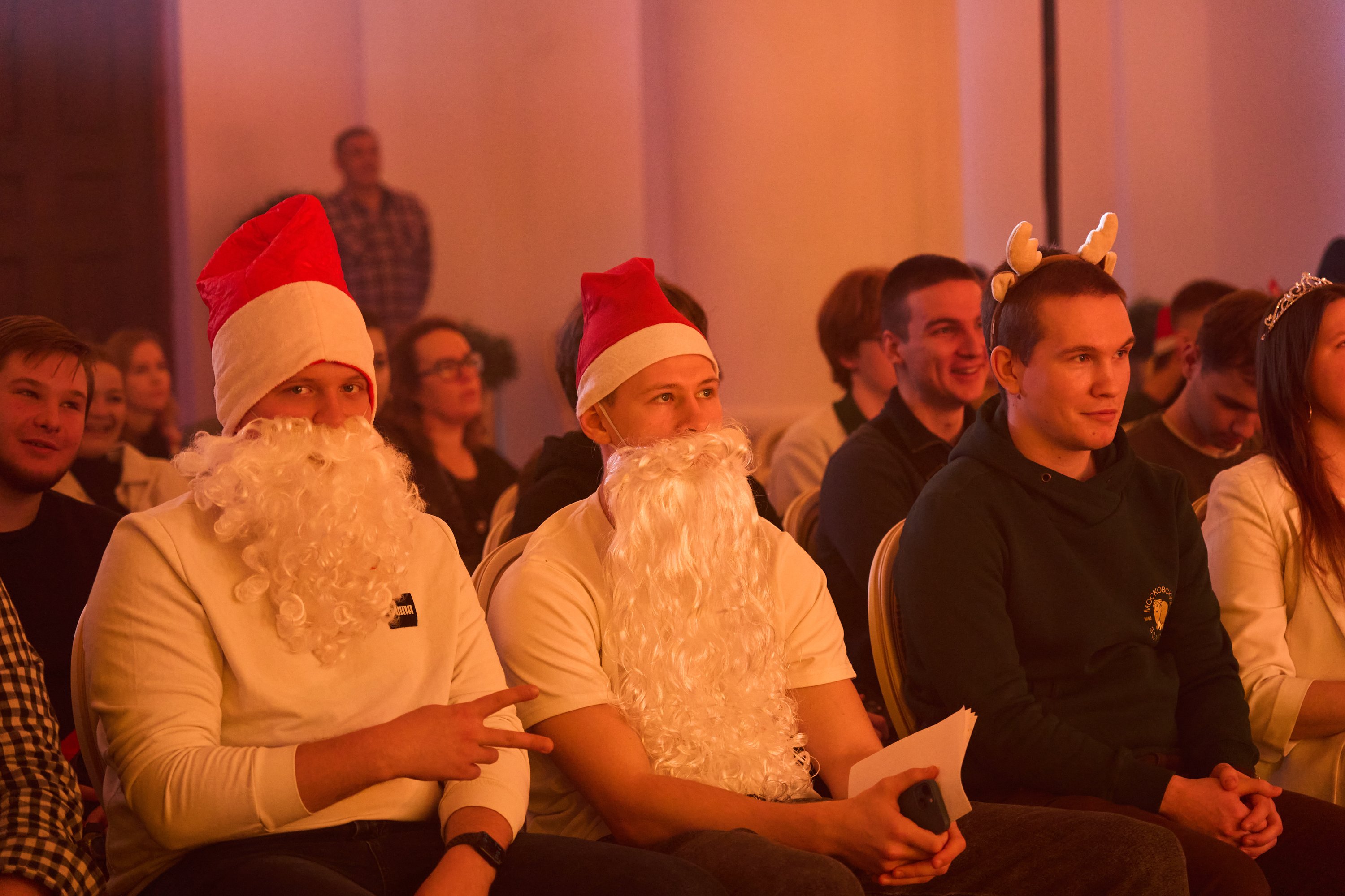 На сцене разыгралось настоящее представление: Лиса (Варвара Романова), Волк (Михаил Палинов) и Снегурочка (Милена Сапегина) искали Деда Мороза (Владислав Павленко), попутно знакомя аудиторию с разработками студентов. Команды представили проекты:
