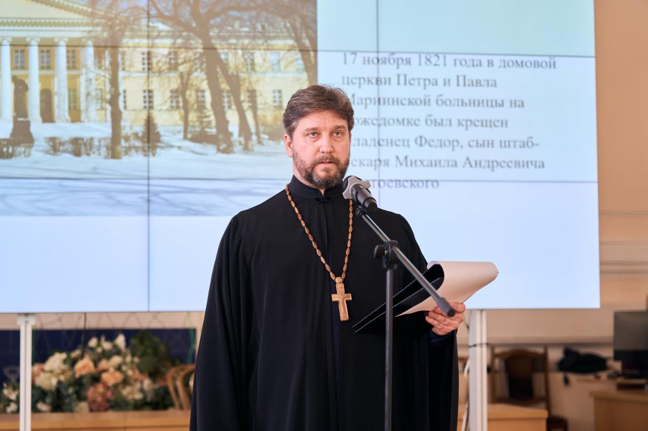 Отец Кирилл поприветствовал гостей и рассказал немного о жизни писателя. «Писателем Фёдор Михайлович стал не сразу. Закончив Главное инженерное училище в Санкт-Петербурге, он служил в Инженерном корпусе. Был на каторге, а затем в ссылке за посещение кружка Михаила Петрашевского, выступавшего за демократизацию политического строя России и освобождение крестьян с землёй. Личная трагедия Достоевского обратила его к вере и наполнила романы христианскими идеалами», — отметил Кирилл Киселёв.