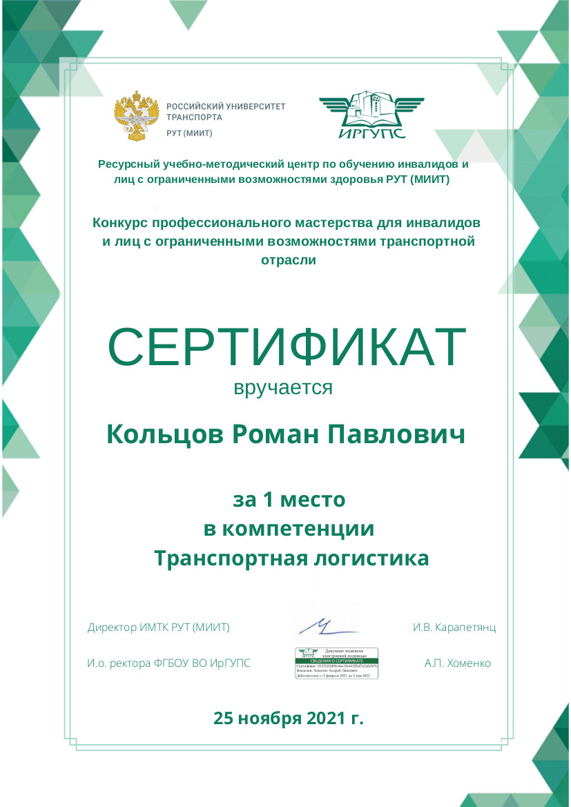 - 2 июня 2021 г. в семинаре «Механизмы развития инклюзивной профессиональной компетентности специалистов психолого-педагогического сопровождения обучающихся с инвалидностью и ОВЗ: современные тренды и перспективы развития» приняла участие и получила сертификат Силина Е.К. На вебинаре присутствовали представители вузов-партнеров: СГУВТ, ДВГУПС, СПбГУГА, СПбГА, ПГУПС, РУТ (МИИТ).