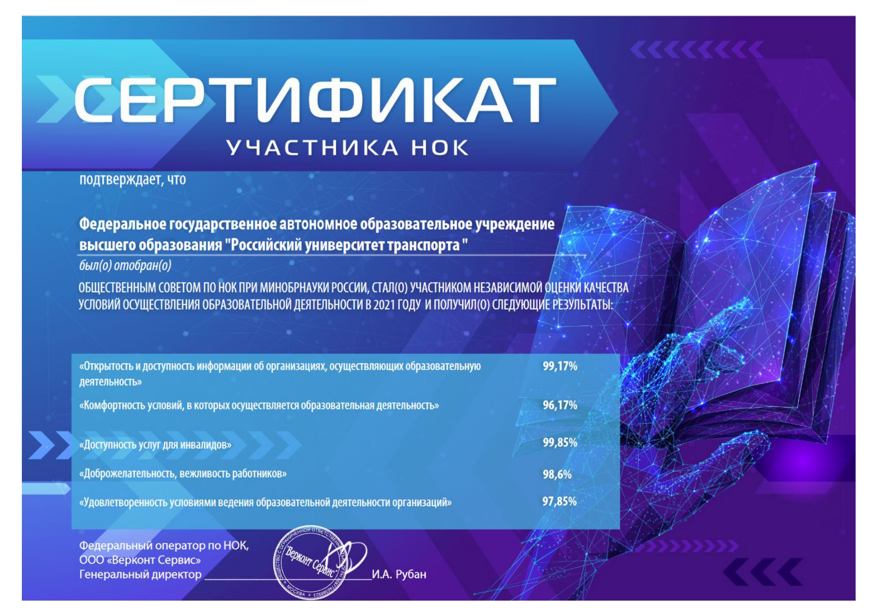 На совещании в Минобрнауки России работа сети РУМЦ Минтранса России получила высокую оценку, принято решение о том, что проект будет продолжен. Отраслевая сеть транспортных вузов в 2021 г. работала эффективно. Большой вклад внесли: ОмГУПС (провели анкетирование выпускников и мероприятие по трудоустройству), ИрГУПС, (организовали конкурс профессионального мастерства), СПбГУ ГА (организовали участие студента в конкурсе профессионального мастерства), РГУПС (провели анкетирование выпускников и студентов). Активное участие в мероприятиях принимали УрГУПС, МГТУ ГА, РГУПС, СПбГУ ГА. В текущем году транспортные вузы прошли процедуру независимой оценки качества условий осуществления образовательной деятельности. Полученный в 2021 г. Сертификат участника НОК содержит высокие оценки по критерию «Доступность услуг для инвалидов»: РГУПС (100 %), ПГУПС (100 %), ВГУВТ, ОмГУПС, РУТ МИИТ (более 99 %).