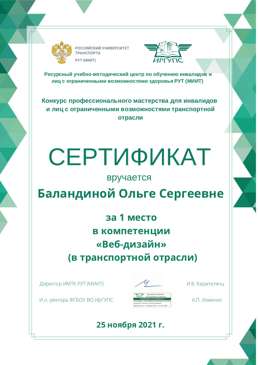 30 ноября 2020 года ресурсный учебно-методический центр по обучению инвалидов и лиц с ограниченными возможностями здоровья РУТ (МИИТ) совместно с ФГБОУ ВО «Иркутский государственный университет путей сообщения» в режиме онлайн провел конкурс профессионального мастерства для инвалидов и лиц с ограниченными возможностями транспортной отрасли по компетенции «Веб-дизайн». Мероприятие организовано в рамках подготовки к национальному и региональному чемпионату по профессиональному мастерству среди инвалидов и лиц с ограниченными возможностями здоровья «Абилимпикс».