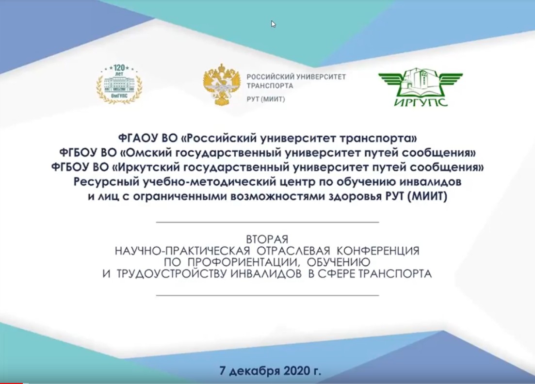 7 декабря 2020 г. состоялась II научно-практическая отраслевая конференция по профориентации, обучению и трудоустройству инвалидов в сфере транспорта. Организаторы конференции – РУМЦ РУТ (МИИТ), Омский государственный университет путей сообщения, Иркутский государственный университет путей сообщения.