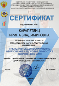 - 12 мая 2021 г. во Всероссийской научно-практической конференции по вопросам развития инклюзивного среднего профессионального образования «Стратегические ориентиры развития образования обучающихся с инвалидностью и ограниченными возможностями здоровья по профессиям и специальностям технического профиля» (г. Череповец) приняла участие и вступила с докладом Карапетянц И.В.;