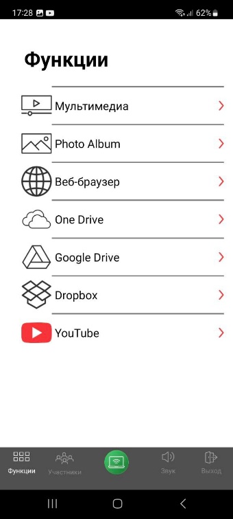 6.7 Источник трансляции выбирается при помощи раздела меню «Функции». Для начала трансляции нажмите на центральную зеленую кнопку приложения.