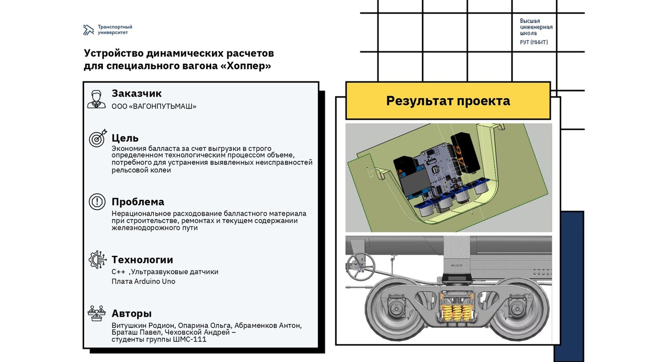Студенты РУТ (МИИТ) разработали устройство динамических расчетов для специального вагона-хоппера. Уникальное решение открывает новые возможности для контроля и измерения выгрузки балластного материала при строительстве, ремонте и текущем содержании ж/д пути.
