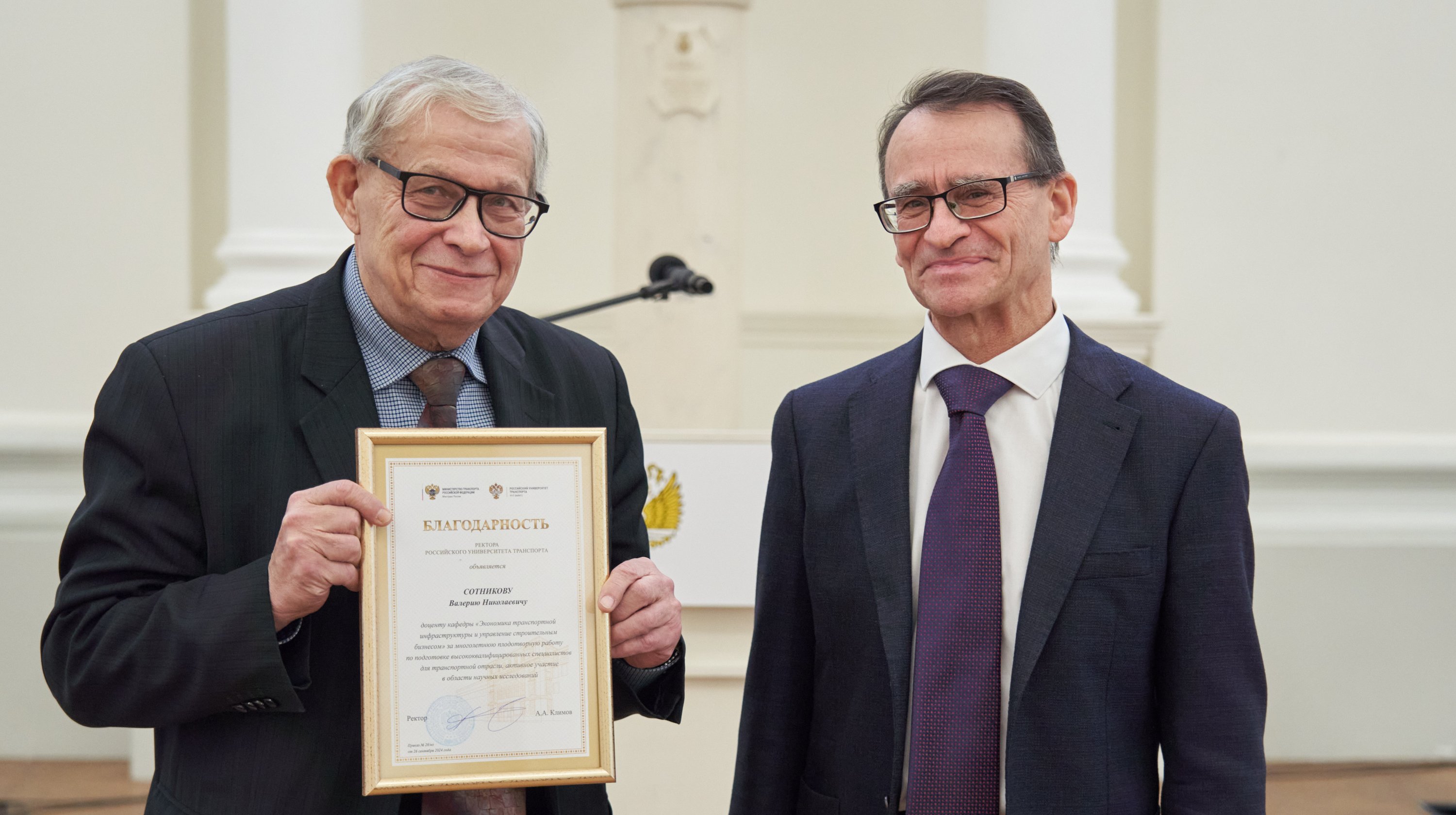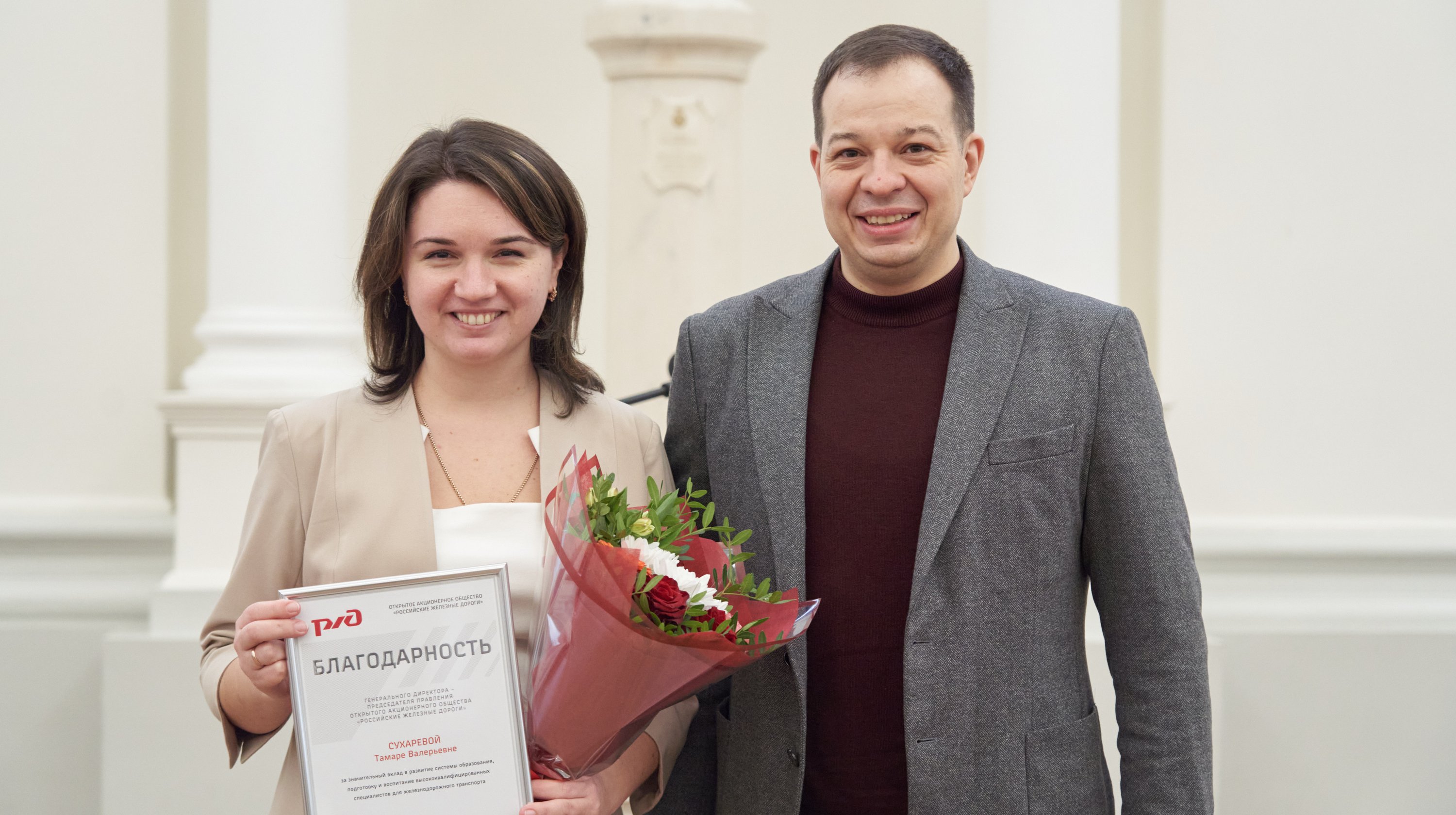 За значительный вклад в развитие системы образования, подготовку и воспитание высококвалифицированных специалистов для железнодорожного транспорта, благодарность генерального директора — председателя правления РЖД выражается: