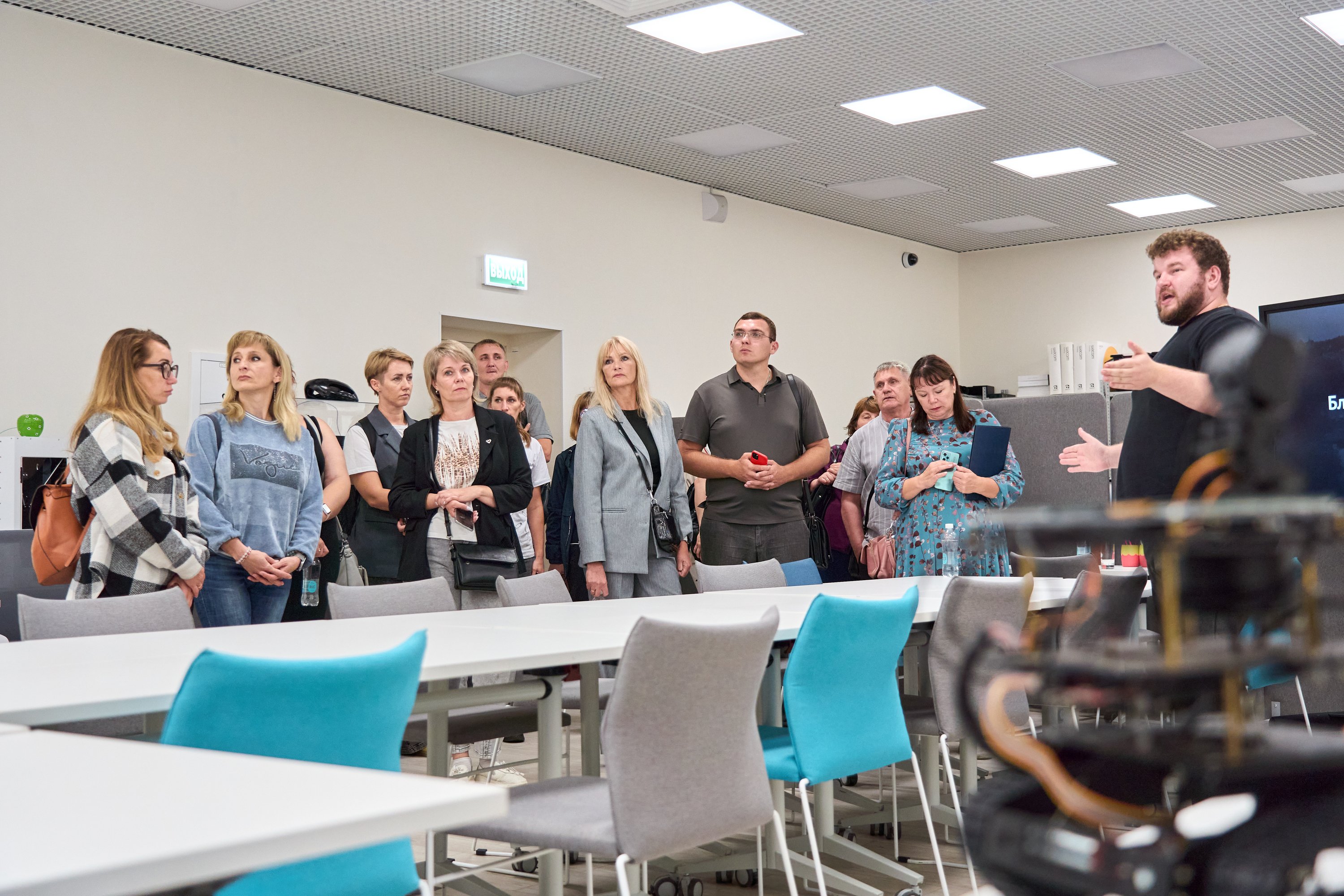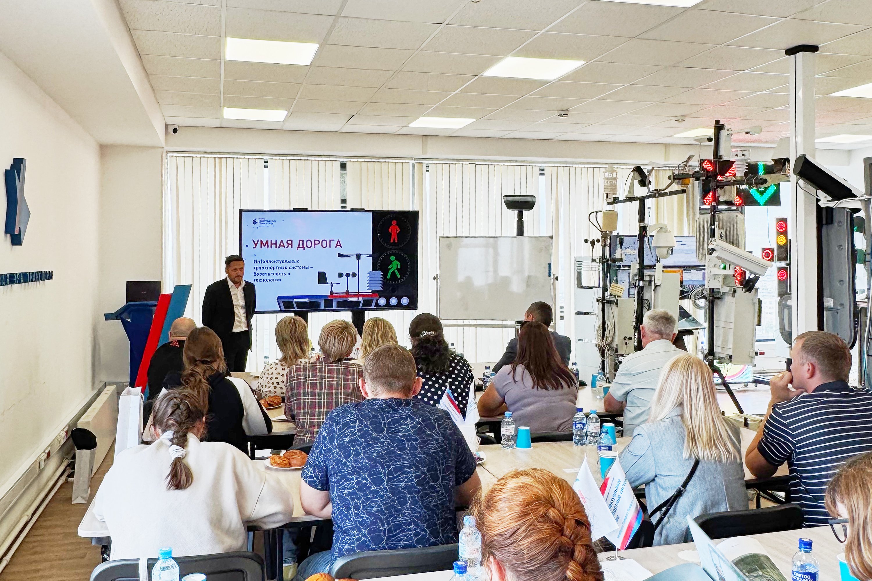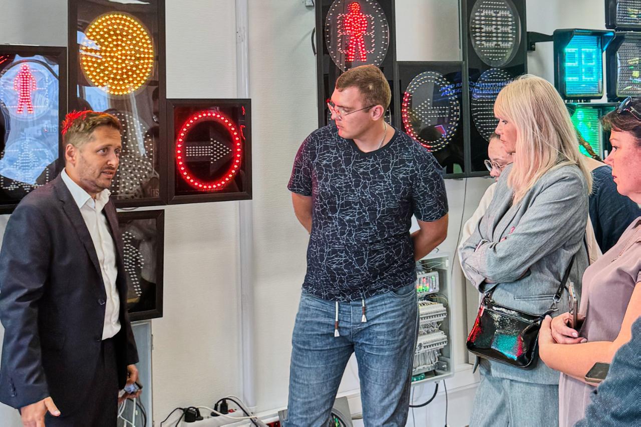 Следующим пунктом для участников стала ассоциация «Цифровая эра транспорта». Исполнительный директор Дмитрий Ольховиков прочитал лекцию о развитии интеллектуальных транспортных систем, цифровых технологиях, внедрённых в транспортную инфраструктуру и роли ИТС в повышении безопасности и эффективности перевозок. Ассоциация поделилась с педагогами опытом работы со школьниками и студентами, а также провела экскурсию по лаборатории, где находится отечественное оборудование: дорожные контроллеры, детекторы транспорта, метеостанции и многое другое.