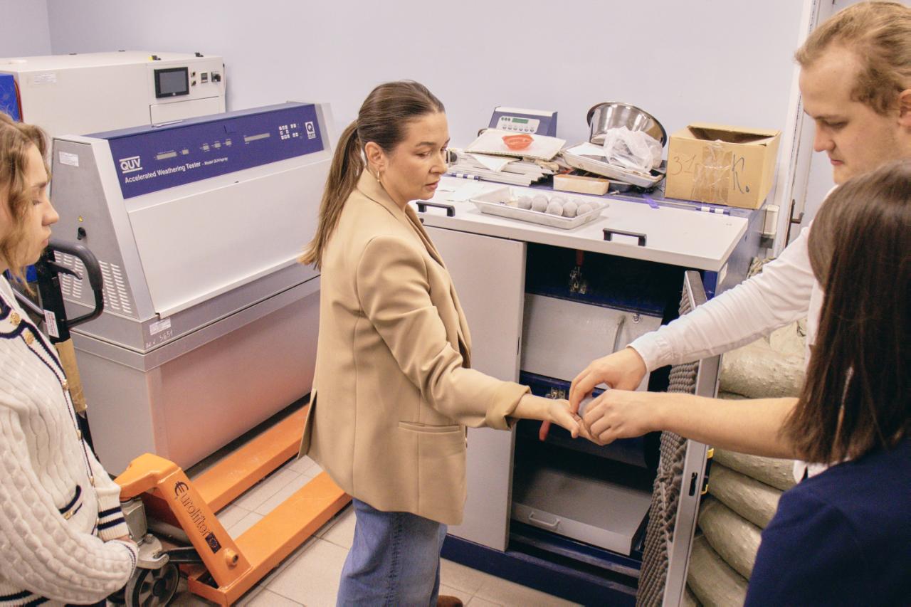 Заместитель начальника управления исследований дорожно-строительных материалов Мария Мерзликина показала ребятам основное оборудование и рассказала подробнее про исследования, которые проводит команда Института. Студенты увидели, как работает оборудование для испытания дорожно-строительных материалов: песка, щебня, битума и битумных вяжущих, грунта, асфальтобетонных смесей и асфальтобетона, цемента, бетона и бетонных смесей, геосинтетических и других, — и испытанные на нём образцы.